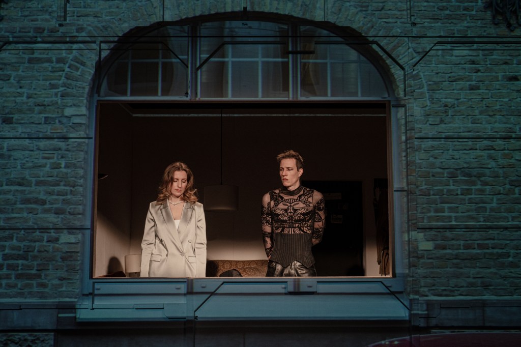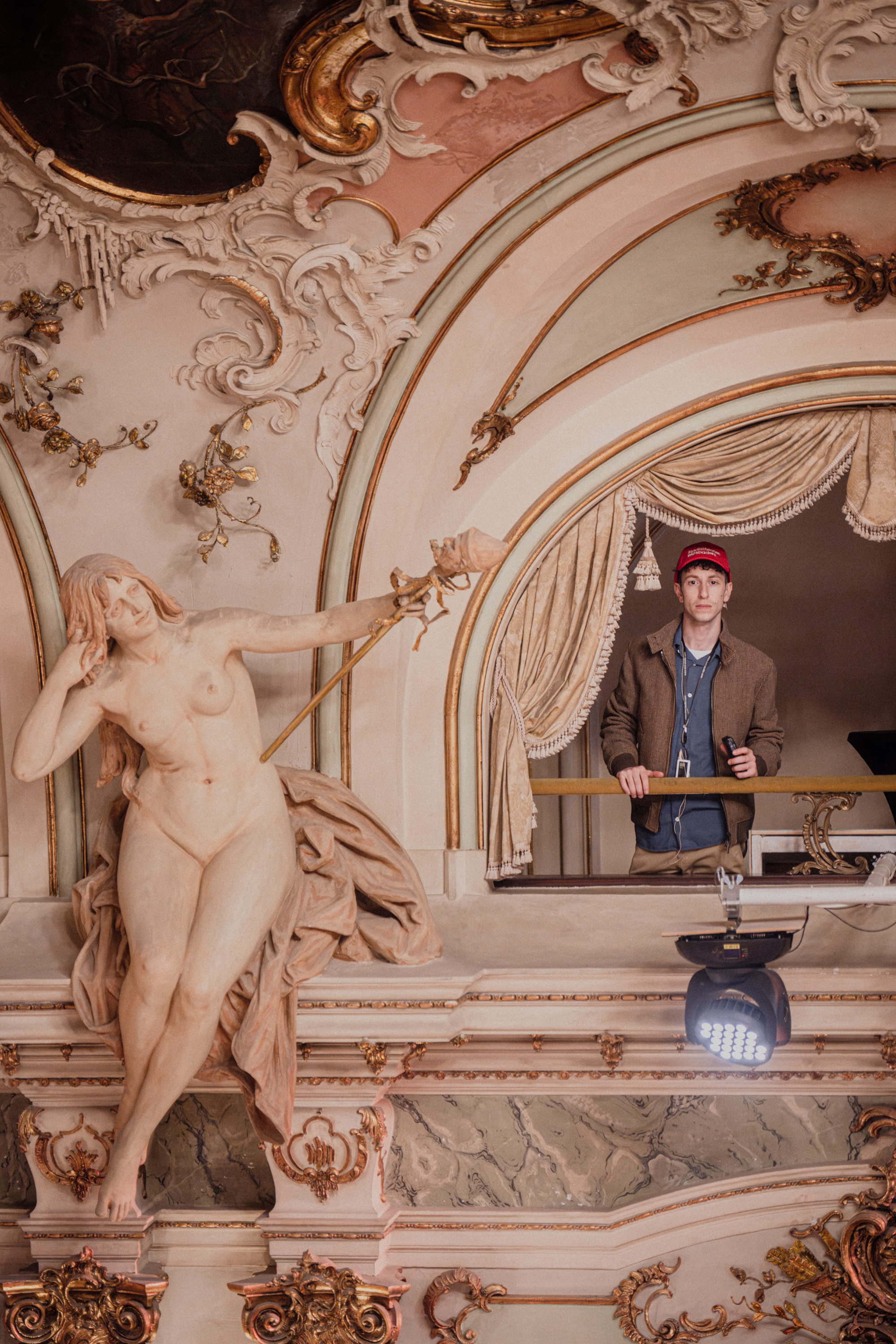 Der „Walk“ trägt der Tatsache Rechnung, dass in der historistischen „Weltkurstadt“ der Schein eine mindestens so tragende Rolle spielt wie das Sein und hinter reichlich vorhandenem Ornament Verbrechen lauern – zum Beispiel kolonialer Art. Dabei wird die Architektur selbst zum Sprechen, zum Klingen gebracht. Im imperialen Privattreppenhaus etwa ist in einer Nische ein Hornist platziert: Jonas Finke erinnert dort in Rokoko-Kostümierung an Kunst als Staffage der Macht. Zum Charme des so unterhaltsamen wie reflektierten Abends trägt bei, dass derweil im Großen Haus große Oper läuft. (…) Im Foyer dürfte dem Publikum später deutlich werden, dass es Teil einer Inszenierung ist: Man wird, mit einem Gläschen alkoholfreien Sekt an Tischchen arrangiert, Statist(in) eines verdächtig gepflegten „Liederabends“, in dem die Komposition selbst mit prachtvollen Stil-Fassaden spielt (…)
